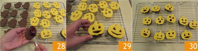 Garnissez les biscuits sombres avec la confiture 28 et refermez-les avec le biscuit clair 29. Les biscuits bicolores cacao et potiron sont prêts à être dégustés 30.