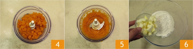 Une fois cuit, mixez-le 4 pour obtenir une purée 5, vous obtiendrez environ 200 g de purée. Laissez refroidir. Une fois le potiron refroidi, préparez la pâte sablée. Versez la farine et le beurre dans un bol 6.