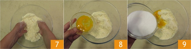 Travaillez avec les mains pour créer une texture sablonneuse 7 puis ajoutez le jaune d'œuf 8 et le sucre 9.