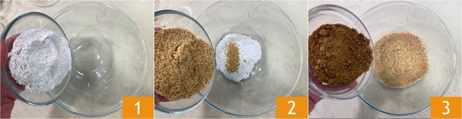 Pour préparer les biscuits complets aux fruits secs, versez dans un grand bol la farine complète 1, la farine de noisette 2 et le sucre muscovado 3.