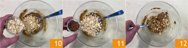 Enfin, ajoutez les amandes effilées 10 et les graines de lin 11. Mélangez jusqu'à obtenir une préparation homogène 12.