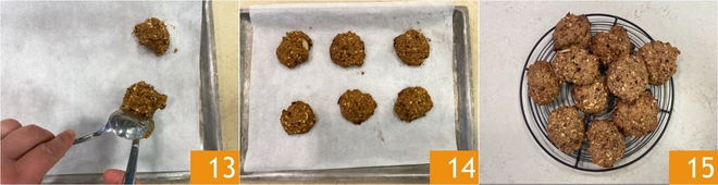 Formez les biscuits en prélevant environ 35 g de pâte à la fois et en les déposant à l'aide de 2 cuillères sur une plaque recouverte de papier cuisson 13 ; avec ces quantités, vous obtiendrez environ 10 biscuits. Faites cuire dans un four statique préchauffé à 180°, puis sortez-les du four et laissez-les refroidir 14. Vos biscuits complets aux fruits secs sont prêts à être dégustés 15 !