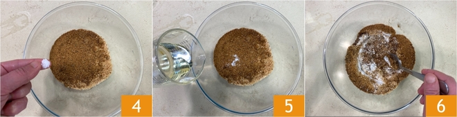 Ajoutez une pincée de sel 4, puis versez progressivement l'huile 5 en mélangeant avec une cuillère 6.