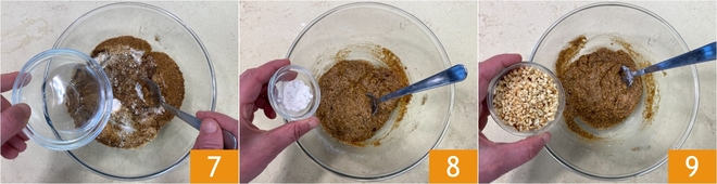 Faites de même avec l'eau 7. Incorporez également la levure chimique 8, puis ajoutez les noisettes concassées 9.