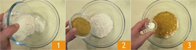 Pour préparer les biscuits complets sans beurre, versez dans un bol tous les ingrédients secs : la farine de seigle complète 1, le sucre de canne 2 et l'ammoniaque pour biscuits 3.