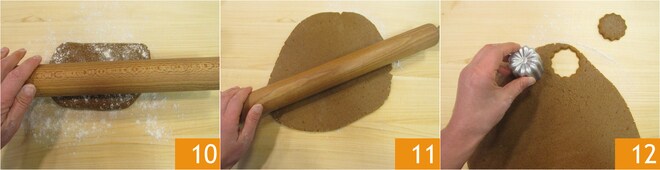 Après le temps de repos de la pâte, étalez-la avec un peu de farine de seigle 10 à une épaisseur de 5 mm 11. Découpez avec la forme que vous avez choisie : nous avons utilisé un emporte-pièce de 5,5 cm de diamètre 12. Travaillez les chutes de pâte pour former d'autres biscuits, avec ces proportions vous obtiendrez 30 pièces.