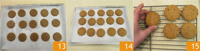 Disposez les biscuits, bien espacés, sur une plaque recouverte de papier sulfurisé 13. Faites cuire dans un four statique préchauffé pendant 20 minutes à 175 °. Une fois le temps de cuisson écoulé, déplacez les biscuits complets sans beurre sur une grille et laissez refroidir 15.