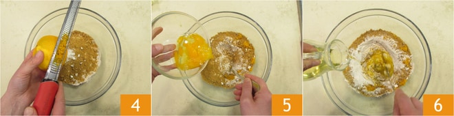 Râpez le zeste d'une orange 4, ajoutez les œufs battus tout en mélangeant avec la fourchette 5. Versez également l'huile de riz en filet 6.