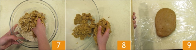 Vous pouvez commencer à pétrir à la main 7. Lorsque les poudres auront absorbé les liquides, placez le tout sur le plan de travail 8. Sans ajouter de farine ou de matières grasses, pétrissez encore jusqu'à obtenir une pâte compacte. Formez une boule et placez-la au réfrigérateur, couverte de film plastique 9, pendant au moins 30 minutes.