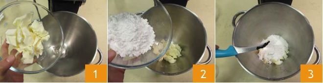 Pour préparer les biscuits danois, commencez par réaliser la pâte. Dans le bol d'un robot pâtissier muni d'une feuille, versez le beurre pommade 1, le sucre glace 2, les grains de la gousse de vanille 3.