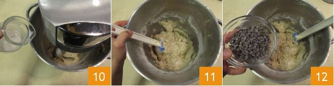 Versez le reste du lait 10, laissez absorber jusqu'à obtenir une pâte crémeuse 11. Ajoutez les pépites de chocolat 12.