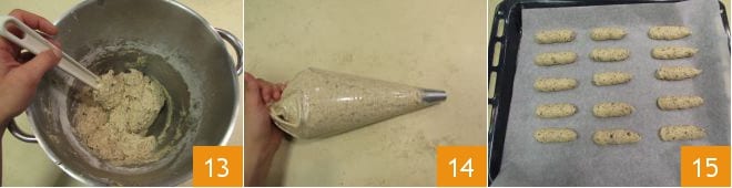 et mélangez encore pour les incorporer au reste 13. Transférez la pâte dans une poche à douille avec une douille lisse de 1 cm 14. Modelez les biscuits en faisant des bâtonnets d'environ 5 cm de long sur une plaque recouverte de papier sulfurisé 15.