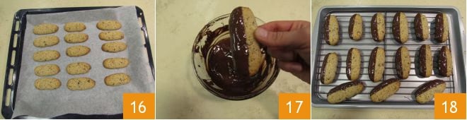 Faites cuire les biscuits dans un four statique à 180° pendant 20 minutes. Sortez les biscuits du four 16, laissez-les refroidir et lorsqu'ils seront complètement froids, vous pourrez en décorer certains en les plongeant à moitié dans le chocolat noir tempéré 17. Vous pouvez les plonger sur le côté le plus long, le plus court ou de manière oblique. Au fur et à mesure que vous trempez les biscuits dans le chocolat, éliminez l'excès sur le bord du bol et placez-les sur un plateau recouvert de papier sulfurisé ou une grille 18. Laissez le chocolat se solidifier dans un endroit frais et dégustez-les !