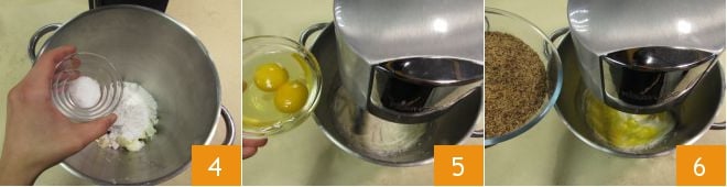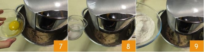 Ajoutez également le sel 4. Mettez la machine en marche à vitesse minimale, puis lorsque les ingrédients commencent à se mélanger, augmentez la vitesse jusqu'à obtenir une crème. Incorporez un œuf 5, laissez-le être absorbé et ajoutez un peu de farine de noisettes 6.