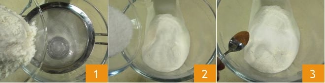 Pour préparer les biscuits de Saint-Martin, tamisez la farine dans le bol d'un robot pâtissier équipé d'un crochet à pétrir 1, ajoutez également le sucre 2, parfumé avec la cannelle en poudre 3