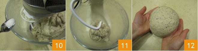 Enfin, incorporez le sel 10 et continuez à pétrir jusqu'à obtenir une pâte lisse et homogène qui se détache des parois et s'accroche au crochet 11. À ce stade, prenez la pâte et pétrissez-la brièvement sur un plan de travail pour lui donner une forme arrondie 12