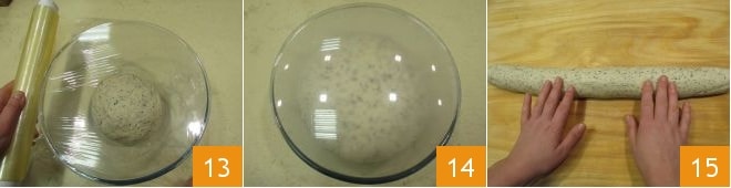 Transférez la pâte dans un bol, couvrez de film alimentaire 13 et laissez lever dans le four éteint avec la lumière allumée pendant 3 heures et demie ou jusqu'à ce qu'elle ait triplé de volume. Une fois levée 14, prenez la pâte et placez-la sur un plan de travail. Formez un boudin 15