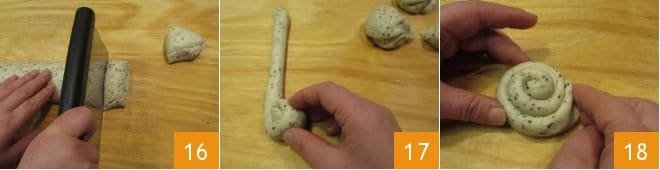 Coupez celui-ci en morceaux d'environ 60 g chacun 16 et avec chaque petit morceau, réalisez des boudins de 26 cm, enroulez le boudin pour créer une forme en spirale (17-18).