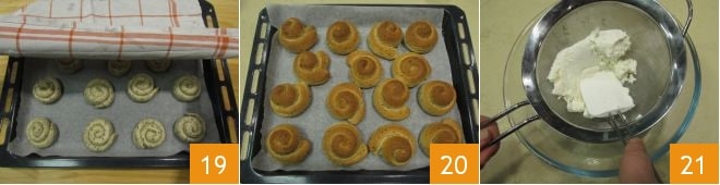 Disposez les petits biscuits sur une plaque recouverte de papier sulfurisé, couvrez d'un torchon 19 et laissez lever 30 minutes à température ambiante. Après la seconde levée, faites cuire les biscuits de Saint-Martin à 180° pendant 30 minutes. Les biscuits doivent être bien dorés 20. Pendant que les biscuits refroidissent, préparez la crème : dans un bol, tamisez la ricotta 21,
