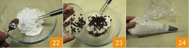 ajoutez le sucre glace, la cannelle 22 et les pépites de chocolat 23. Mélangez pour amalgamer les ingrédients, transférez la crème dans une poche à douille avec embout lisse 24 et mettez-la à raffermir au réfrigérateur.