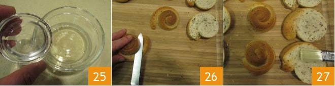 Dans un petit bol, diluez le muscat avec l'eau 25, puis récupérez les biscuits bien froids, coupez-les en deux 26 et badigeonnez l'intérieur avec le sirop au muscat 27.