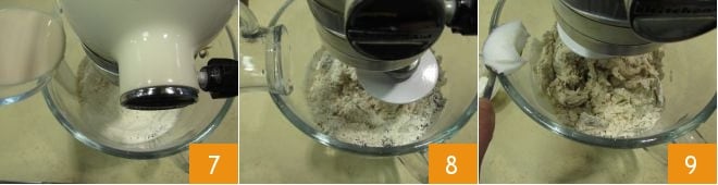 Actionnez le robot à faible vitesse et versez petit à petit l'eau où vous avez dissous la levure 7, ajoutez toujours petit à petit le reste de l'eau 8. Incorporez également le saindoux, une cuillerée après l'autre 9.