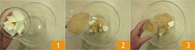 Pour préparer les biscuits de Noël sans gluten, versez dans un bol le beurre ramolli 1, le sucre de canne 2 et une cuillère à café de gingembre 3.