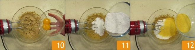 Ajoutez également les 2 jaunes d'œufs et continuez à mélanger jusqu'à ce qu'ils soient incorporés 10. Ajoutez la farine de riz 11 et la farine de maïs 12.