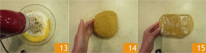 Mélangez à nouveau avec le batteur jusqu'à ce que les deux farines soient bien absorbées 13. Lorsque vous obtenez une pâte homogène, transférez-la sur un plan de travail et compactez-la 14. Formez une boule, enveloppez-la dans du film plastique 15 et placez au réfrigérateur pendant au moins une heure.