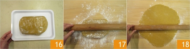 Lorsque la pâte est raffermie, sortez-la du réfrigérateur 16. Transférez-la sur un plan fariné et étalez-la avec un rouleau à pâtisserie 17 jusqu'à obtenir une épaisseur de 1 cm 18.