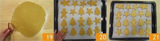 Formez les biscuits en utilisant les emporte-pièces de votre choix 19 et disposez-les progressivement sur une plaque recouverte de papier sulfurisé 20. Faites cuire dans un four statique préchauffé à 185°C pendant 12-15 minutes. Lorsqu'ils sont bien dorés, sortez-les du four 21, laissez-les refroidir et servez-les ainsi ou amusez-vous à les décorer avec le Glaçage royal.