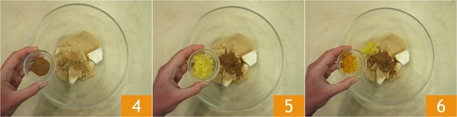 Ajoutez également une cuillère à café de cannelle en poudre 4, le zeste d'un citron et le zeste d'une orange râpés 5 6.