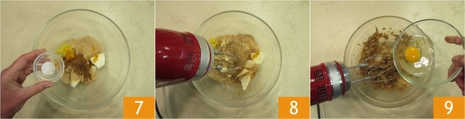 Ajoutez une pincée de sel 7 et mélangez avec un batteur électrique 8 jusqu'à obtenir un mélange homogène. Ajoutez l'œuf entier 9 et mélangez à nouveau.