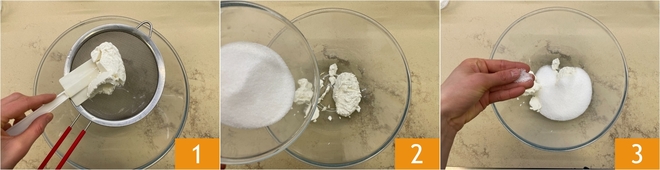 Pour préparer les biscuits pascaux à la ricotta, commencez par la ricotta : égouttez-la très bien puis tamisez-la dans un grand saladier pour éliminer les grumeaux et la rendre plus veloutée 1. Ajoutez le sucre 2 et une pincée de sel 3.