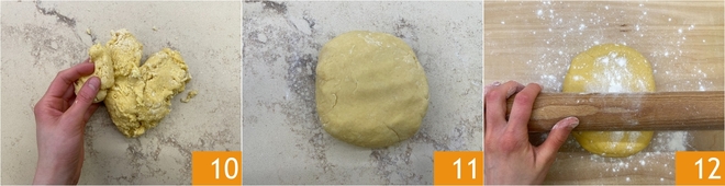 Dès que la préparation se compactera, transférez-la sur le plan de travail et terminez de pétrir à la main 10. Après avoir formé un pâton 11 et l'avoir enveloppé dans du film alimentaire, laissez-le reposer au réfrigérateur pendant au moins 3 heures ou toute la nuit. Une fois le temps de repos écoulé, travaillez à nouveau la pâte pour lui redonner de l'élasticité et étalez-la au rouleau sur une surface farinée 12.