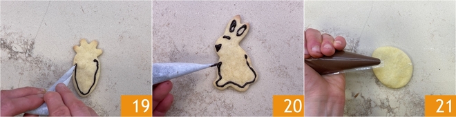 En attendant, hachez et faites fondre le chocolat au bain-marie ou au micro-ondes. Quand les biscuits seront complètement refroidis, utilisez un cornet en papier pour dessiner le contour et les détails des formes 19 20. Pour les biscuits œil-de-bœuf, transférez la crème à tartiner aux noisettes dans une poche à douille sans embout 21.