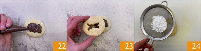 Garnissez les bases au centre 22, refermez avec le biscuit évidé 23 et saupoudrez la surface de sucre glace 24.