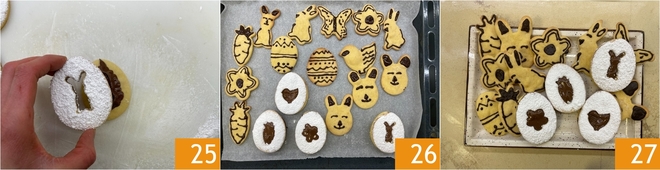Faites coïncider les deux parties 25 et laissez durcir le chocolat noir 26. Vos biscuits pascaux à la ricotta sont prêts à être dégustés 27 !