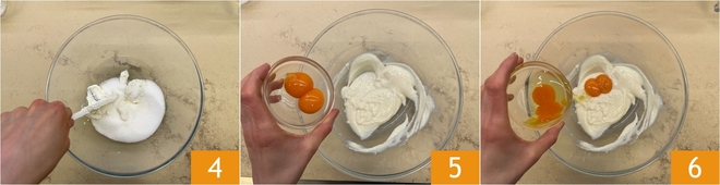 Mélangez avec une maryse jusqu'à ce que le mélange soit homogène et crémeux 4. Ensuite, ajoutez les jaunes d'œufs 5 et l'œuf entier 6.