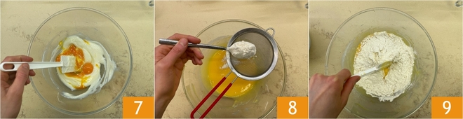 Continuez à mélanger 7 pour tout amalgamer. Tamisez également la farine 8 et commencez à l'incorporer dans le bol avec une spatule 9.