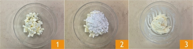 Pour préparer les biscuits fantôme, commencez par mettre dans un bol le beurre mou, mais encore malléable, coupé en dés 1. Ajoutez le sucre glace 2 et mélangez avec une cuillère en bois jusqu'à obtenir une consistance crémeuse 3.