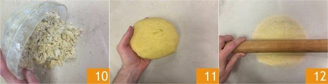 Quand la farine commencera à être absorbée, transférez la préparation sur un plan de travail 10 et travaillez-la avec les mains. Pétrissez le temps nécessaire pour obtenir une boule lisse 11. À ce stade, étalez-la entre 2 feuilles de papier sulfurisé 12 et placez-la au réfrigérateur pour raffermir pendant 30 minutes.