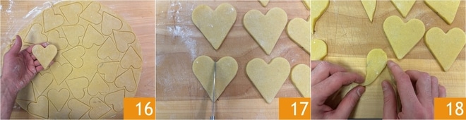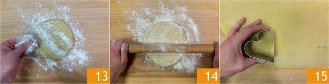 Après ce temps, reprenez la pâte sablée et placez-la sur une planche à pâtisserie. Farinez-la bien 13 et étalez-la avec le rouleau à pâtisserie jusqu'à obtenir une épaisseur d'environ 3-4 mm 14. Si la pâte sablée est trop dure, laissez-la s'acclimater avant de l'étaler. À ce stade, à l'aide d'un emporte-pièce en forme de cœur (grand de 8x8 cm) découpez vos biscuits 15.