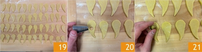 Soulevez-les délicatement un par un 16 et réutilisez les chutes de pâte. Répétez cette opération pour obtenir environ 25 cœurs. Puis, divisez chacun en deux 17. Prenez une des moitiés et avec les mains, formez une goutte en tournant la pointe finale 18.