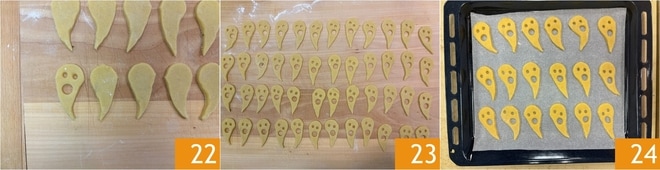 Le premier petit fantôme est prêt 22; répétez la même opération pour les autres 23 et transférez-les délicatement sur une plaque recouverte de papier sulfurisé 24.