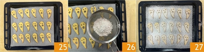 Faites cuire les biscuits fantôme dans un four statique préchauffé à 170°C pendant 13-15 minutes. Lorsqu'ils seront légèrement dorés, sortez-les du four et laissez-les refroidir 25, puis saupoudrez-les de sucre glace 26 et servez vos biscuits fantôme 27!