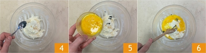 Ajoutez ensuite les graines d'une gousse de vanille 4 et versez les œufs légèrement battus 5. Mélangez bien avec la cuillère 6.