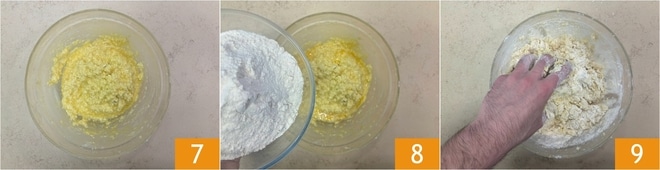 Ne vous inquiétez pas si la préparation semble déliée 7. Ajoutez la farine en une seule fois 8 et commencez à pétrir avec les mains 9.
