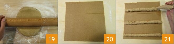 Reprenez la pâte, retirez le film, saupoudrez légèrement le plan de travail et étalez la pâte avec un rouleau 19 pour former un carré de 30x30 cm. Rectifiez les bords pour obtenir la bonne dimension, puis coupez le carré en 3 bandes de 10 cm de largeur 20. Avec la poche à douille, réalisez une bande de garniture le long du côté long de chaque bande de pâte 21.