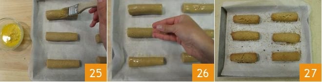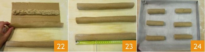Roulez la pâte pour couvrir la garniture jusqu'à obtention de 3 rouleaux 22. Laissez-les reposer au réfrigérateur pendant 5 minutes. Coupez ensuite chaque rouleau en 3 morceaux de 10 cm de longueur chacun 23 et placez-les sur une plaque avec du papier sulfurisé 24.